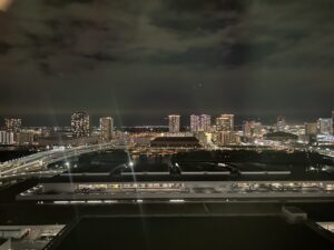 東京の夜景は明るかった(笑)部屋では、相変わらずの折りたたみマット持参で一人練習。